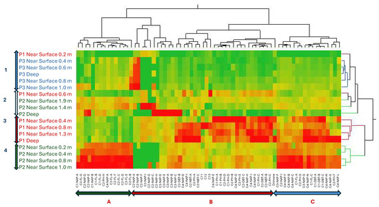 Two-way Hierarchical Clustering Analysis (HCA) between the solvent extractable isomers and high-resolution depth profiles of 2017 BML FFT. The conditioning formula within the HCA color map utilizes a red-green color schematic where red indicates relatively elevated abundances between all platform depth intervals, while green inversely indicates depleted abundances. Three distinct clusters of isomer concentration were present (Groups A and B), while the depth intervals clustered together to form four distinct clusters (Groups 1–4).