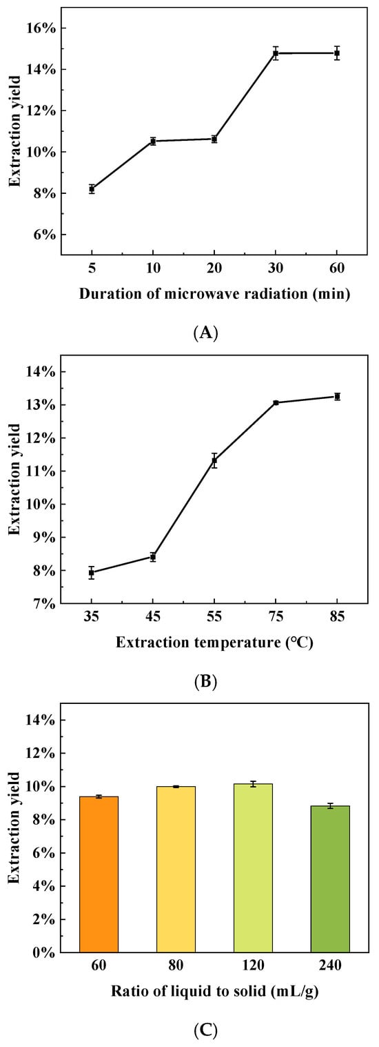 The ratio of liquid to solid is considered one of the most important factors in microwave extraction []. Figure 1C depicts the impact of ratio of liquid to solid on extraction yield. With the increase in ratio of liquid to solid, extraction yield first increased and then decreased rapidly. And the peak of extraction yield appeared at a ratio of liquid to solid of 120 mL/g.