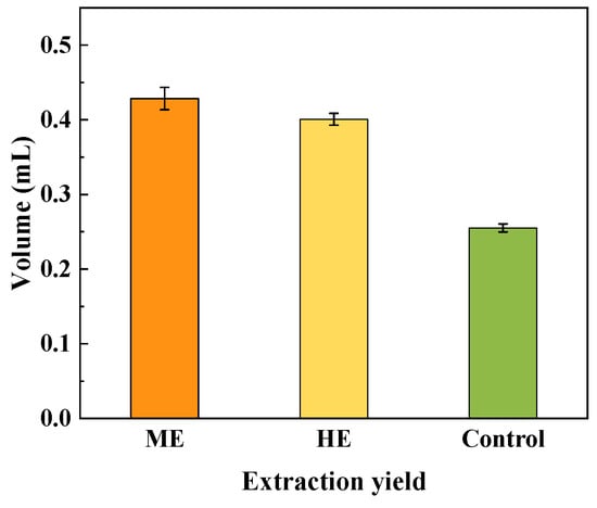 Influence of different extraction methods on volumes of leaf powders. ME, leaf samples after microwave extraction; HE, leaf samples after heating extraction; Control, leaf samples without extraction.