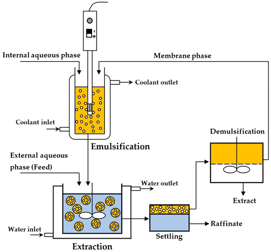 Emulsion liquid membrane (ELM) extraction is a compelling solution that combines extraction and stripping within a single, self-contained droplet system. The internal aqueous (stripping) phase is stabilized by a surfactant and dispersed into very fine droplets, ranging from 1 to 3 µm, via high-speed agitation [13]. These droplets are then encapsulated within the organic membrane phase, forming a water-in-oil (W/O) emulsion. The resulting emulsion disperses into the external aqueous feed phase as globules ranging from 100 to 2000 µm in diameter [13]. The dispersed emulsion’s high interfacial surface area dramatically accelerates mass transfer, enabling rapid uptake of solutes without requiring large external tanks or multistage contactors. Compared to thermal or crystallization methods, energy demands are reduced, and the compact, modular configuration of ELM facilitates scaling up and on-site deployment [14,15]. Tailoring the membrane composition allows operators to achieve remarkable selectivity for solutes. The closed-loop nature of the process reduces solvent inventory and minimizes reagent losses.