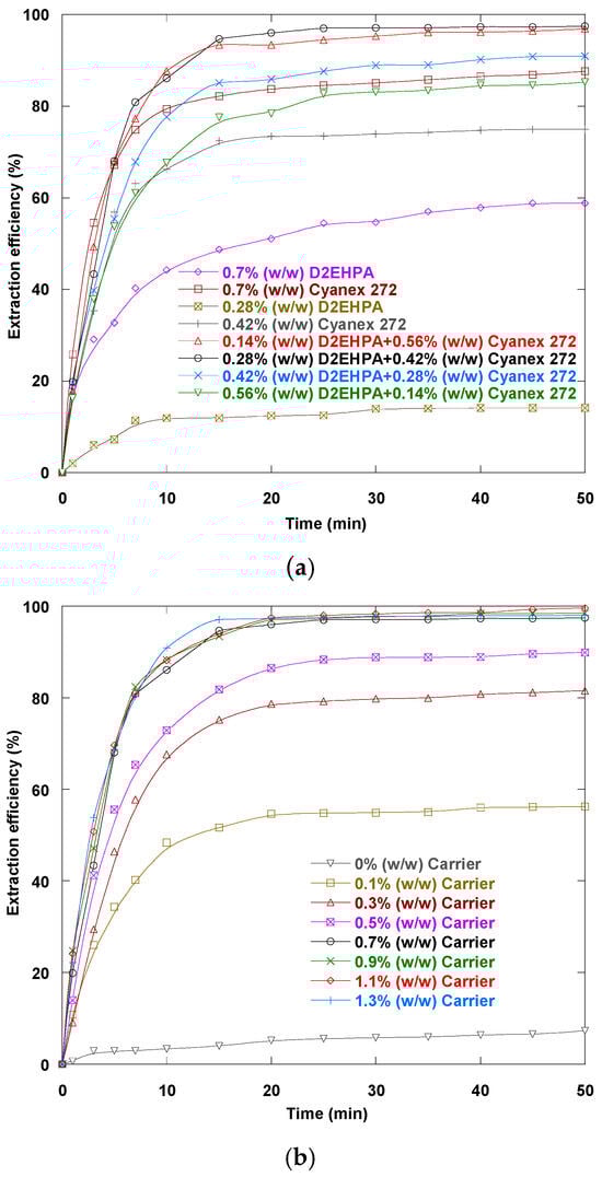 Effect of Cyanex 272, D2EHPA, their mixture (a), and carrier concentration (b) on Dy(III) extraction (100 mg/L) via the ELM process (emulsion volume: 20 mL; external phase (Dy(III) solution) volume: 200 mL; Span 80 concentration: 0.75% (w/w); emulsification time: 5 min; internal phase to organic phase volume ratio: 1/1; stirring speed: 250 rpm; W/O emulsion to external phase volume ratio: 20/200; internal phase concentration (HNO3): 0.2 N; pH of the feed phase: 5.8 (natural); diluent: kerosene; temperature: 15 °C).