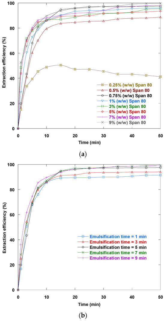 Figure 3b shows that higher concentrations of Span 80 lead to quicker attainment of the steady state. The initial steep ascent of the extraction curve at these concentrations indicates reduced mass transport resistance, likely due to the formation of smaller, more stable emulsion droplets. In contrast, incomplete emulsification at lower surfactant levels results in larger droplet sizes. This limits the effective interfacial area for mass transport, thereby slowing the extraction process. Excessive amounts of surfactant can augment the liquid membrane viscosity, which complicates the subsequent demulsification process necessary for recovering the internal phase. Additionally, the economic implications of using high surfactant levels must be considered, as the increased cost must be justified by improved extraction efficiency. Thus, optimizing ELM systems often involves finding a balance between achieving high extraction rates and maintaining manageability and cost-effectiveness. For this reason, the surfactant concentration in the liquid membrane was kept at 0.75% (w/w) for all subsequent experiments.