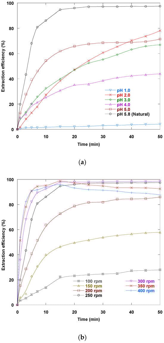 Effect of external feed phase pH (a) and stirring speed (b) on Dy(III) extraction (100 mg/L) via the ELM process (emulsion volume: 20 mL; external phase (Dy(III) solution) volume: 200 mL; Span 80 concentration: 0.75% (w/w); Cyanex 272 + D2EHPA concentration: 0.7% (w/w); emulsification time: 5 min; internal phase to organic phase volume ratio: 1/1; stirring speed: 250 rpm for (a); W/O emulsion to external phase volume ratio: 20/200; internal phase concentration (HNO3): 0.2 N; pH of the feed phase: 5.8 (natural) for (b); diluent: kerosene; temperature: 15 °C).