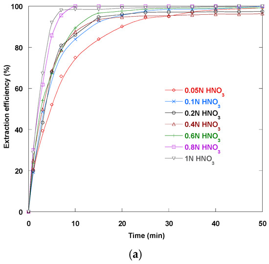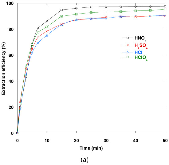 Selecting the right internal aqueous stripping solution is essential for achieving optimal efficiency and maximum yield when extracting Dy(III) ions via the ELM method. In an ELM system, the internal solution removes the recovered species from the organic membrane and regenerates the carrier. This maintains a driving force for mass transfer. Figure 6a compares the performance of four mineral acid species at 0.2 N in the internal phase on extraction efficiency over time. This detailed kinetic profile reveals how acid type affects stripping capability and, consequently, overall Dy(III) recovery. The extraction behavior indicates that nitric acid is more effective than perchloric acid. Perchloric acid, in turn, is more effective than sulfuric and hydrochloric acids, which have similar effects.