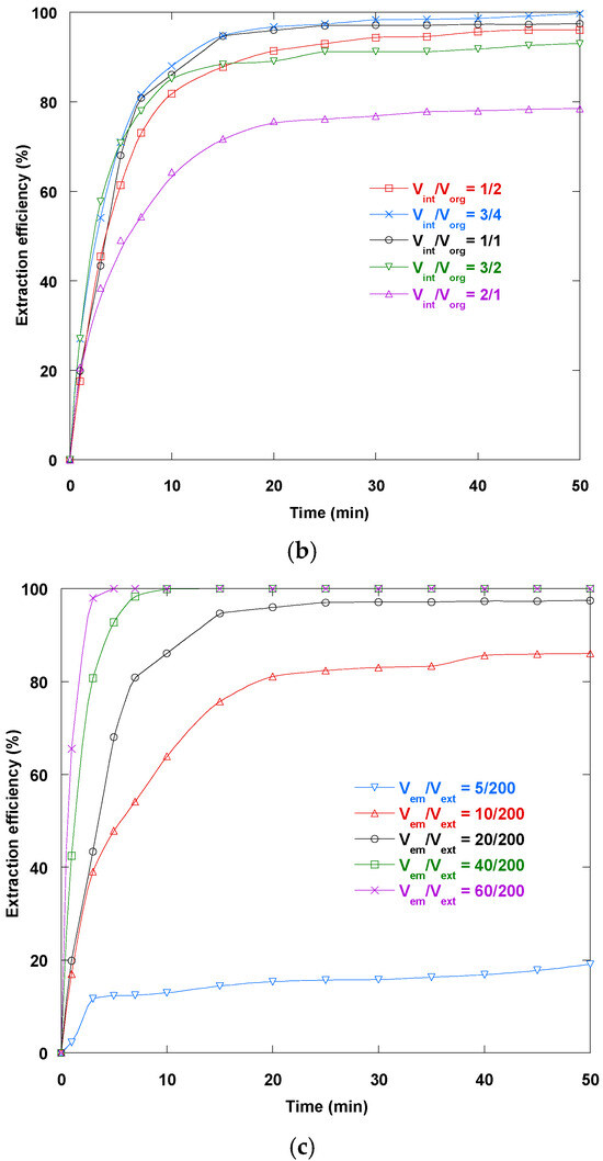 Figure 6c offers a compelling insight into how the treatment ratio directly influences the recovery effectiveness of Dy(III) via the ELM technique. In this system, the emulsion acts as the medium that transports Dy(III) ions from the aqueous external phase into the internal stripping phase. As the volume ratio increases from 5/200 to 60/200, there is a proportional enhancement in available interfacial area between the emulsion globules and the feed solution, which in turn accelerates the mass transfer. Notably, at the highest ratio examined (60/200), the extraction efficiency rapidly climbs to 100% within 5 min, whereas a low ratio such as 5/200 only reaches about 19.1% even after 50 min. This strongly suggests that a higher emulsion volume in relation to the external phase provides more interfacial contact area, thereby reducing diffusion distances and driving a more efficient uptake of Dy(III). Diving deeper into the mechanism, the extraction across an ELM is typically governed by a series of resistances: the external aqueous boundary layer, the liquid membrane, and the internal stripping phase. Increasing the treatment ratio effectively multiplies the number of micro-droplets present, each acting as a micro-reactor for Dy(III) extraction. This multiplication not only increases the aggregate interfacial area available for the ion transport but also minimizes the path length that Dy(III) ions must traverse. Consequently, the residence time for the ions in the external solution decreases, and their diffusion into the interior of each droplet is greatly facilitated. Additionally, the steep kinetic profiles at higher volume ratios suggest that mass transfer is primarily controlled by interfacial phenomena rather than by bulk diffusion limitations.