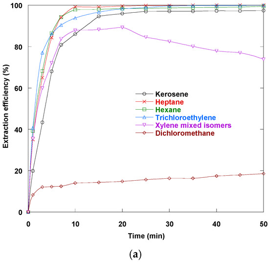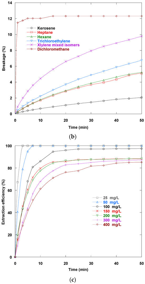 Figure 7a illustrates the significant impact of selecting the right diluent on the recovery efficiency of Dy(III) in an ELM technique. Figure 7b shows the temporal variation in emulsion breakage for the tested diluents. In these experiments, the extraction efficiency of several diluents, including dichloromethane, heptane, hexane, trichloroethylene, and xylene mixed isomers, was compared to that of kerosene over 50 min. The first set of diluents notably facilitated a rapid extraction process, achieving an efficiency greater than 86% within the first 10 min. In contrast, dichloromethane severely underperformed, remaining below an efficiency of 18.6%. Closer examination of the underlying mechanisms reveals that the high extraction efficiencies observed with xylene mixed isomers, heptane, hexane, trichloroethylene, and kerosene are primarily due to the favorable physicochemical properties of these compounds. These diluents typically have lower viscosities and interfacial tensions, which are essential for the fast diffusion of Dy(III) ions from the feed phase into the organic membrane. Lower interfacial tension supports the generation of a stable emulsion and enhances the partitioning of the Dy(III)–carrier complex into the organic phase. Conversely, dichloromethane’s higher polarity results in higher interfacial tension, hindering efficient mass transfer and reducing its overall extraction efficiency.