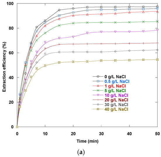 Effect of salt NaCl concentration (a) and water matrices (b) on Dy(III) extraction (100 mg/L) via the ELM process (emulsion volume: 20 mL; external phase (Dy(III) solution) volume: 200 mL; Span 80 concentration: 0.75% (w/w); Cyanex 272 + D2EHPA concentration: 0.7% (w/w); emulsification time: 5 min; stirring speed: 250 rpm; internal phase to organic phase volume ratio: 1/1; W/O emulsion to external phase volume ratio: 20/200; internal phase concentration (HNO3): 0.2 N; pH of the feed phase: 5.8; temperature: 15 °C; diluent: kerosene).