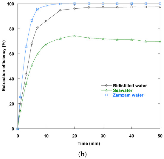 Figure 9b shows the varying extraction efficiencies of Dy(III) from two water sources, seawater and Zamzam water, using the developed ELM process. The 97.5% extraction efficiency in bidistilled water indicates favorable mass transfer conditions because there are no interfering ions present, and the interfacial conditions are optimized for the carrier extractant. In contrast, the extraction efficiency decreases in seawater. It peaks at approximately 72.1% after 15 min due to the high ionic strength of chloride ions and competing cations, which interfere with the carrier’s ability to form complexes with Dy(III) ions. After 15 min, the extraction efficiency in seawater decreases slightly and reaches 69.8% after 50 min. Meanwhile, Zamzam water exhibits the highest performance, reaching 100% efficiency after 20 min, likely due to its favorable composition. Zamzam water contains a specific balance of minerals that enhances emulsion stability, facilitating remarkably higher extraction kinetics and efficiency. This balanced ionic environment minimizes unwanted interactions at the membrane interface while favoring the formation of stable Dy(III)–carrier complexes.