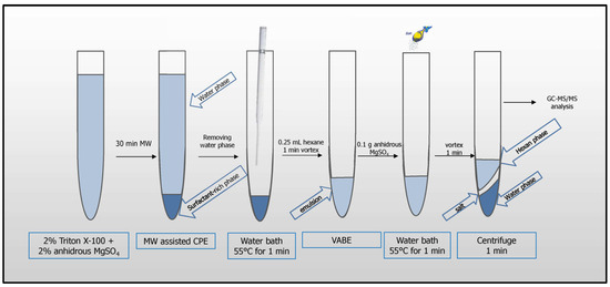The following procedure was optimized and applied for pesticide analysis: 8 mL of apple juice or 2 mL of lemon juice diluted with 6 mL of water were pipetted into a 12 mL glass tube. 2 mL of 10% (m m−1) aqueous solution of Triton X-100 was added to the samples (0.2 g of MgSO4 was also added to the diluted lemon juice). The extraction systems were placed in a water bath and heated in a microwave system (Section 2.3) above the cloud point temperature for 30 min until two phases were formed: a surfactant-rich phase (lower layer) and an aqueous phase (upper layer). The tubes were left at room temperature, 24 °C ± 2 °C, to cool down (~10 min) and placed in a refrigerator (~30 min) to increase the viscosity of the surfactant-rich phase. The supernatant was removed with a Pasteur pipette. To reduce viscosity, the surfactant-rich phase was placed in a water bath at 55 °C for 1 min, then 0.25 mL of hexane was added, and re-extraction was performed by vortex agitation for 1 min. Then, 0.1 g of MgSO4 was added to the resulting emulsion, followed by subsequent heating in a water bath at 55 °C for 1 min, and vortex agitation for 1 min. The samples were centrifuged for 1 min at 900× g, and then the aliquot volume of 1 µL from the supernatant (hexane phase) was injected for analysis (Figure 1).