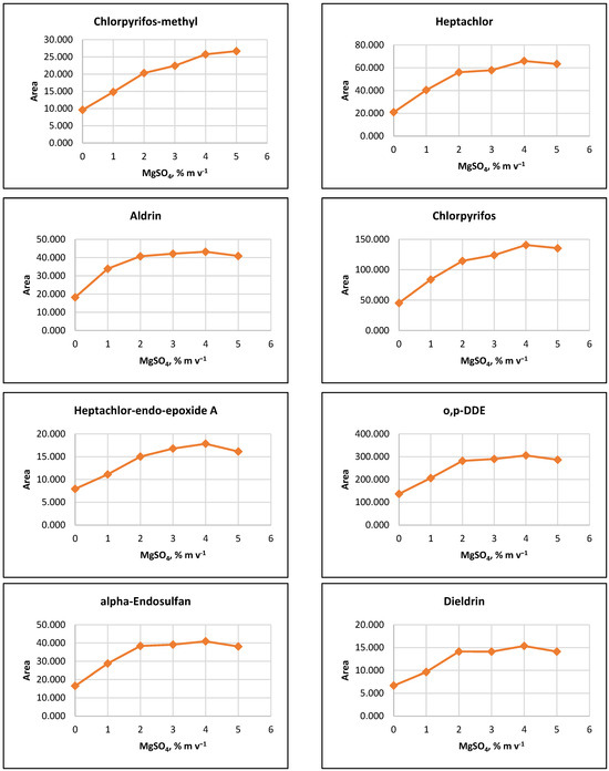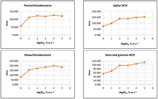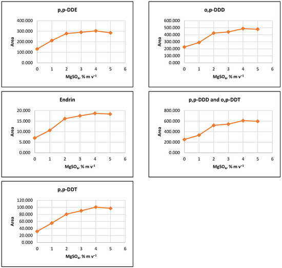 Salting out effect at 1%, 2%, 3%, 4% and 5% (m v−1) MgSO4 and without salt content. Conditions: CPE—2% (m m−1) Triton X-100, pesticide concentration 10 µg L−1, 30 min MW incubation time; re-extraction—2 mL hexane, without added water.
