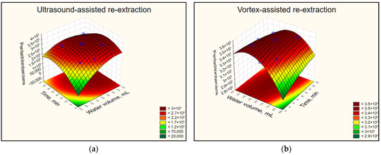 To investigate the effect of adding water in combination with ultrasonic or vortex agitation, two central composite designs were created for each agitation method using the statistical software Statistica 14.1.0.8 (TIBCO Statistica, USA). The two factors (water volume and re-extraction time) have been varied as shown in Supplementary Materials Tables S1 and S2. A hot plate was used to perform the CPE, and the volume of hexane for re-extraction was fixed at 2 mL. The remaining experimental parameters were set as specified in point 2.4.