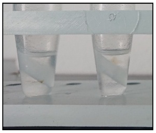 A probable explanation for this phenomenon is that the excess quantity of solid salt (MgSO4) caused the formation of a saturated salt solution within the surfactant-rich phase, increasing the polarity of the water contained therein. Thermodynamically, it can be assumed that this results in the aggregation and enlargement of the dispersed hexane microdroplets into a separate layer. The formation of an intermediate layer of undissolved MgSO4 (Figure 4) further facilitated pipetting an aliquot of the hexane for subsequent analysis. It is noteworthy that, as a consequence of the optimization carried out, the step involving cooling the samples in a freezer was rendered unnecessary.