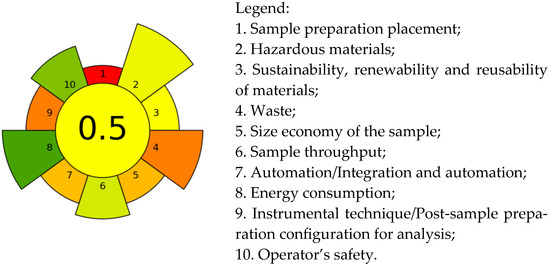 The “greenness” of the developed method was assessed using the AGREE prep software [40] with a maximum score of 1 and green color coding for the low environmental impact of the method. The pictogram of the proposed method, presented in Figure 5, displays the distribution according to relevant assessment criteria.