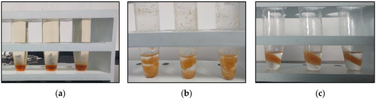 Sample preparation steps of a red apple juice at DF = 1.25 (a) surfactant-rich phase obtained without addition of MgSO4 at the CPE step, (b) at the re-extraction step with 0.25 mL hexane and (c) after centrifugation.