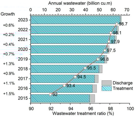 - Department of Urban Social and Economic Survey, National Bureau of Statistics. 9 National Urban Drainage and Wastewater Treatment in Past Years (1978–2023). In China Urban Statistical Yearbook 2023; China Statistics Press: Beijing, China, 2024. [Google Scholar]