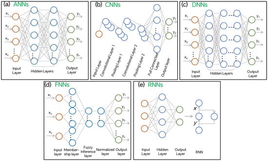 | DNNs | Deep Neural Networks | High expressive power enables the model to learn complex patterns in data effectively. Automatic feature extraction reduces reliance on manual feature engineering. | High model complexity makes it prone to overfitting. DNNs require high computational resources and strong hardware support. | DNNs model complex relationships in wastewater treatment, predicts efficiency and energy consumption, and optimizes operational parameters. | [49,50] |