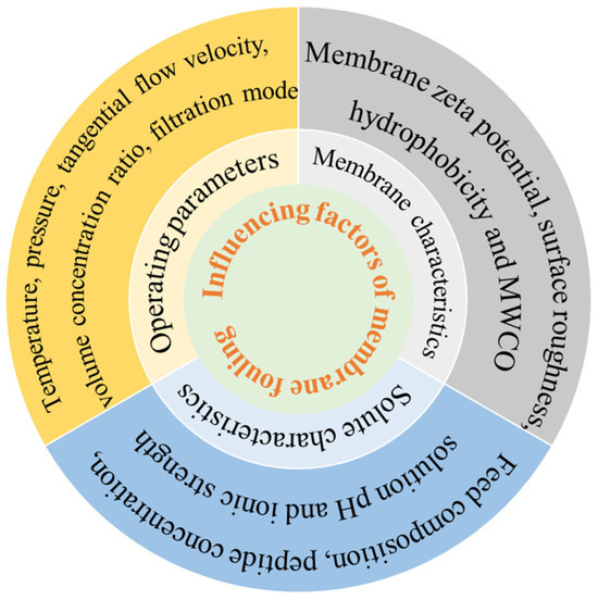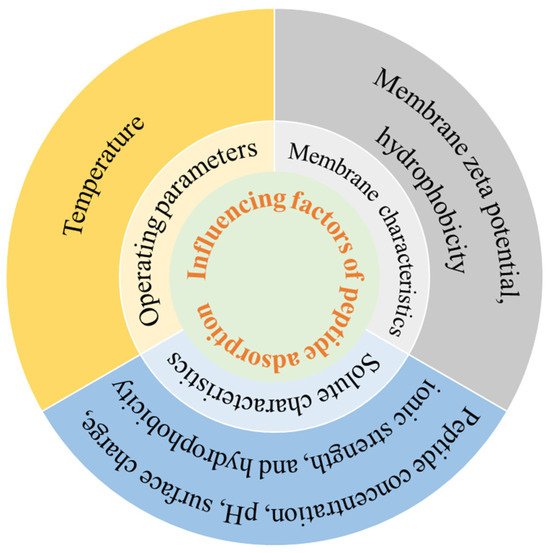 Due to the presence of membrane contaminants, polypeptides are inevitably adsorbed to the pore or surface of the membrane. Protein–membrane interactions are key factors determining protein adsorption in membrane filtration systems, which are mainly manifested as electrostatic interactions and hydrophobic interactions between peptides and membranes [43,44]. Membrane adsorption is a component of membrane fouling and is also affected by polypeptide properties, membrane properties, and operation conditions, as outlined in Figure 3.