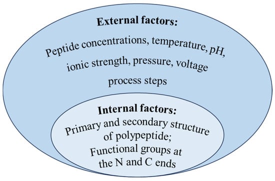 The aggregation of polypeptides multiplies the size of the polymer, which will prevent polypeptides from penetrating the membrane, and results in poor selectivity for membrane separation based on the screening effect. Although studies on the aggregation behavior of peptides remains limited, analogous phenomena of protein self-assembly has been extensively documented. Starting with internal conformational changes, some protein–protein interactions led to the formation of dimers and oligomers [53], then dimers or oligomers continued to aggregate and grow under hydrophobic, electrostatic, and covalent interactions, finally forming polymers and even visible insoluble particles [54,55]. Protein aggregation can occur through different mechanisms or pathways, and different pathways may occur simultaneously. Majid et al. [56] summarized five main polymerization mechanisms as follows: reversible self-assembly of the native monomer, aggregation of conformationally altered monomeric proteins, aggregation of chemically modified protein, nucleation-controlled aggregation of protein, and surface-induced aggregation of protein. However, regardless of the mechanism, peptide aggregation may be affected by both internal and external factors, as outlined in Figure 4.