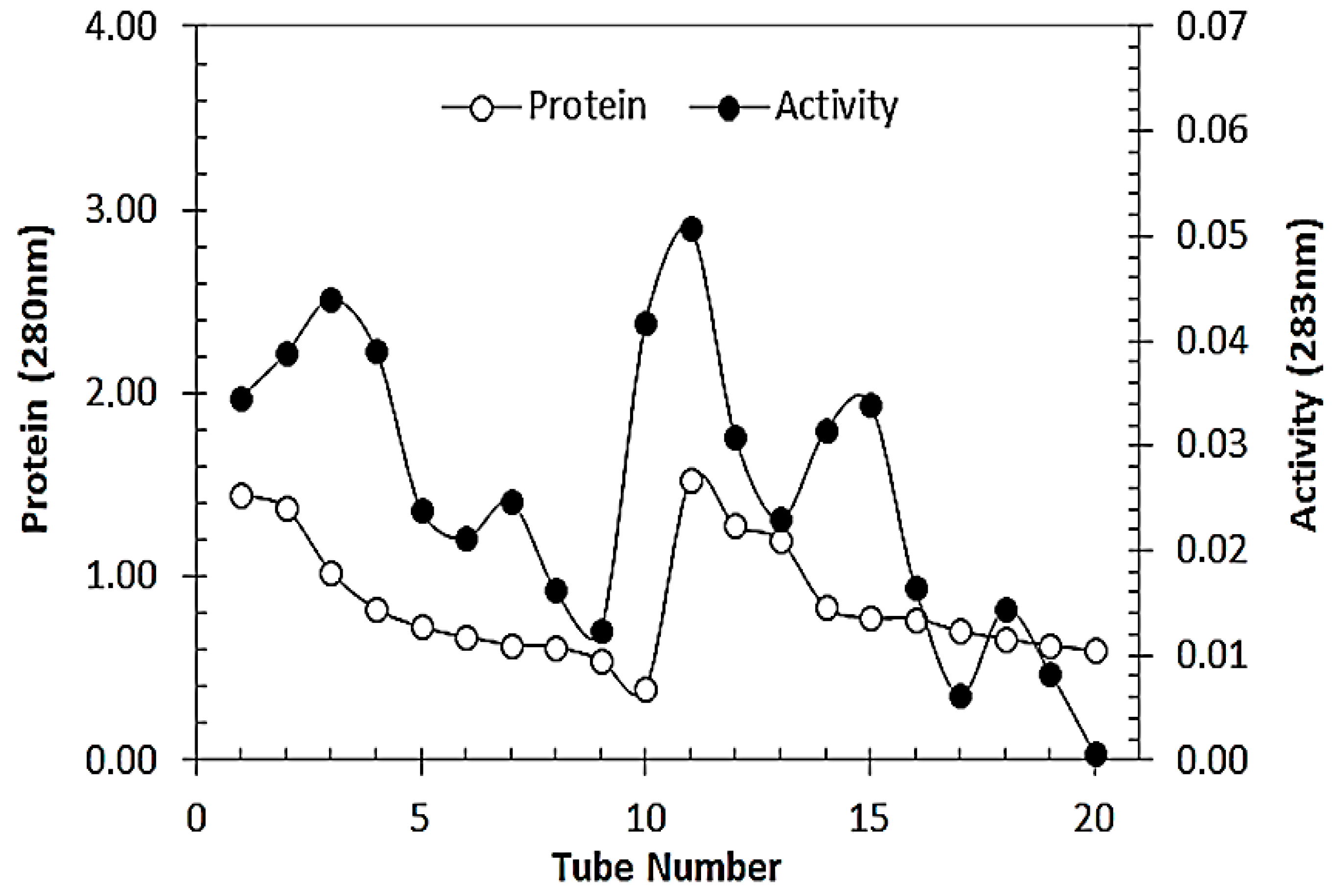 2.2.1. Partial Purification of Crude PAL Extract Isolated from Red Clover Leaf (RCL-PAL)