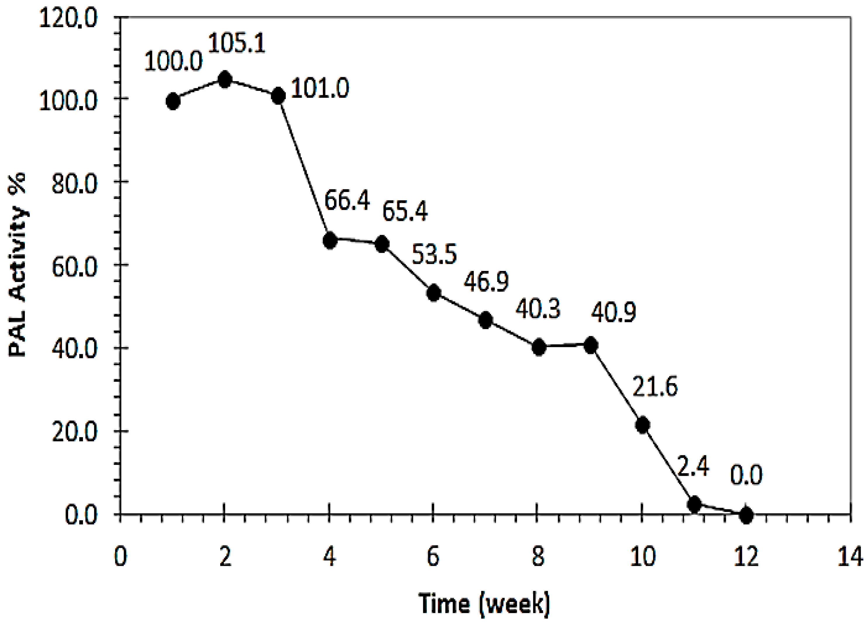 - Aydaş, S.B.; Şirin, S.; Aslim, B. Biochemical analysis of Centaurea depressa phenylalanine ammonia lyase (PAL) for biotechnological applications in phenylketonuria (PKU). Pharm. Biol. 2016, 54, 2838–2844. [Google Scholar] [CrossRef]