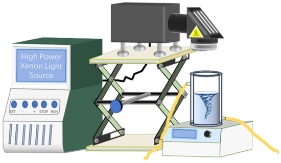 A 300 W xenon lamp (PLS-SXE300D, PerfectLight, Beijing, China) equipped with a filter (UVCUT420, PerfectLight, Beijing, China) was used as visible light source, which was placed 12 cm away from the liquid surface of the solution. The photocatalytic activity of the catalysts was investigated using TC-HCl as the target pollutant. A schematic diagram of the photocatalytic experimental setup is illustrated in Figure 1. Typically, 100 mg of photocatalyst was dispersed in 200 mL of TC-HCl aqueous solution (30 mg/L) in a double-walled cylindrical quartz reactor. The pH of the initial TC-HCl solution was measured to be 4.2 ± 0.1 using a digital pH meter (PHSJ-4F, INESA Scientific Instrument Co., Ltd., Shanghai, China), and no further adjustment was made to investigate the photocatalytic performance under natural acidic conditions, which is common for tetracycline antibiotics solutions. The suspension was continuously stirred using a magnetic stirrer to keep the catalyst in suspension. To maintain a constant temperature of 25 ± 1 °C throughout the experiment, cooling water was circulated through the jacket of the reactor. First, the photocatalyst sample was stirred in a dark reaction vessel for 45 min to achieve adsorption–desorption equilibrium; then, the jacketed beaker was placed under a visible light source for the photocatalytic reaction. During the latter, 3 mL of the suspension was collected every 15 min and passed through a 0.22 μm filter membrane. Subsequently, the residual concentration of TC-HCl was determined by measuring absorbance at 357 nm using a UV-vis spectrophotometer (UV-2600, Shimadzu, Kyoto, Japan). The TC-HCl removal efficiency in the reaction system was determined using Equation (1):