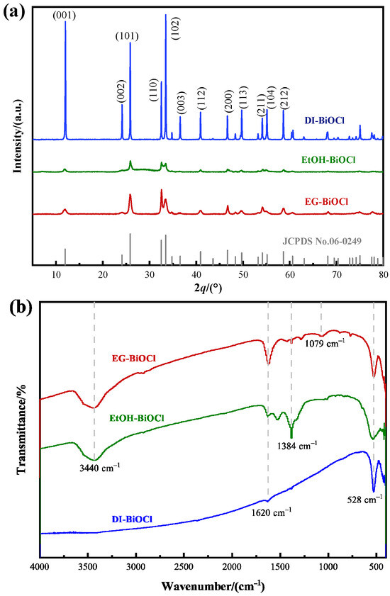 The crystal structure and phase composition of DI-BiOCl, EtOH-BiOCl, and EG-BiOCl were analyzed by XRD. As shown in Figure 2a, the diffraction peaks at 2θ = 12.0°, 25.9°, 32.5°, 33.5°, 40.9°, 46.7°, 49.7°, 54.1°, 58.6°, and 68.25° corresponded to the (001), (002), (101), (110), (102), (003), (112), (200), (113), (211), (104), and (212) crystal planes (ICDD No. 06-0249), confirming successful synthesis. The sharp diffraction peaks indicate high crystallinity. To quantitatively compare the crystallite sizes, the Scherrer equation (D = Kλ/(βcosθ), where D is the crystallite size, K = 0.94, λ = 0.15406 nm, β is the full width at half maximum (FWHM), and θ is the Bragg angle) was applied to the main (101) diffraction peak. The calculated average crystallite sizes were approximately 45.2 nm for DI-BiOCl, 32.8 nm for EtOH-BiOCl, and 28.1 nm for EG-BiOCl. This quantitative trend—where crystallite size decreases with increasing solvent viscosity—fully corroborates the qualitative morphological order observed in the SEM images (Figure 3). Broader peaks and lower intensity in the XRD patterns are indicative of smaller crystallite sizes, which is validated by the calculated values.