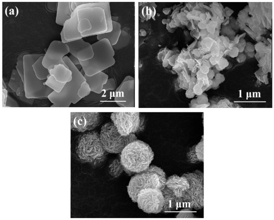 SEM images of DI-BiOCl (a), EtOH-BiOCl (b), and EG-BiOCl (c).