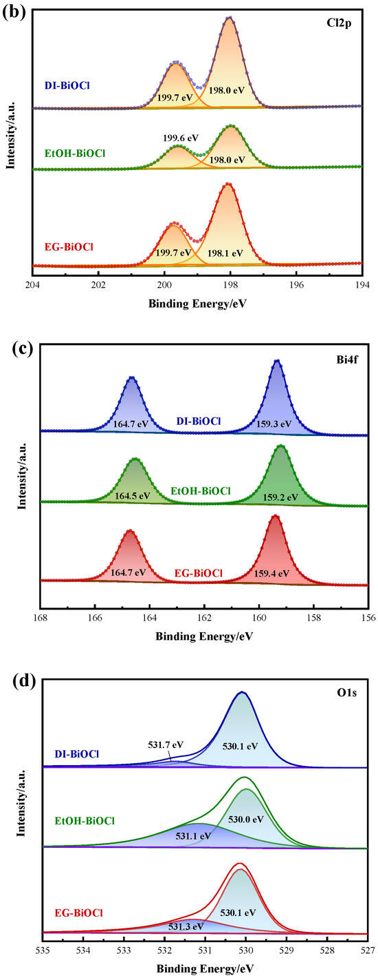 XPS characterization was performed to analyze elemental composition and chemical states of DI-BiOCl, EtOH-BiOCl, and EG-BiOCl samples, as shown in Figure 4, with all spectra calibrated using the C1s peak at 284.8 eV.