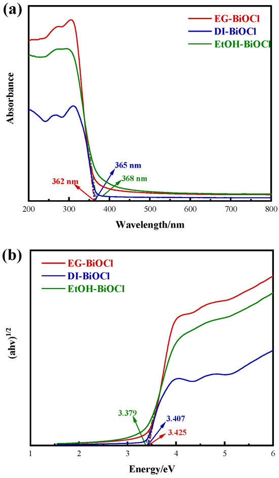 UV-vis DRS diagram (a) and band gap diagram (b) of DI-BiOCl, EtOH-BiOCl, and EG-BiOCl.