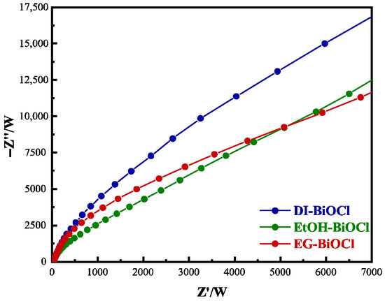 EIS analyzed charge carrier separation and transfer efficiency in DI-BiOCl, EtOH-BiOCl, and EG-BiOCl. As shown in Figure 6, DI-BiOCl exhibited the largest EIS arc radius, followed by EtOH-BiOCl, with EG-BiOCl showing a marginally smaller radius than EtOH-BiOCl. The arc radii decreased with increasing solvent viscosity. Smaller radii indicate lower charge transfer resistance and enhanced photocatalytic efficiency. This radius progression (DI > EtOH > EG) aligns with the photocatalytic activity ranking of the samples.