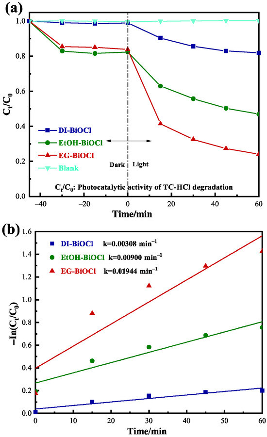 The photocatalytic degradation performance of each sample toward TC-HCl under visible light is shown in Figure 7a. In control experiments, TC-HCl (30 mg/L) remained nearly constant in concentration under both dark and illuminated conditions, confirming its structural stability and resistance to natural photodegradation. Distinct variations emerged upon adding 0.50 g/L of different photocatalysts. After 45 min of dark adsorption and subsequent 60 min visible light irradiation, EG-BiOCl achieved better TC-HCl removal by 76%, attributable to its unique microsphere architecture and greater absorption intensity. In contrast, DI-BiOCl and EtOH-BiOCl exhibited significantly lower removal rates of 18% and 53%, respectively. As shown in Figure 7a, the concentration of TC-HCl remained nearly constant under both dark conditions and visible light irradiation without a catalyst (photolysis), indicating that direct photolysis and self-degradation were negligible.