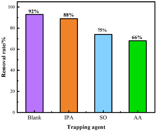 To test the photocatalytic activity of the present materials, IPA, SO, and AA were used as scavengers of •OH, h+, and •O2− (TC-HCl: 30 mg/L; photocatalyst: 0.30 g/L), in order to identify the main active species in the photocatalytic system.