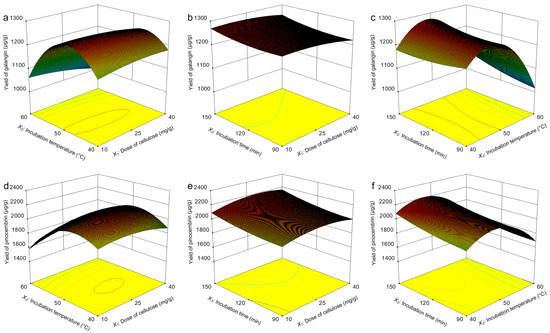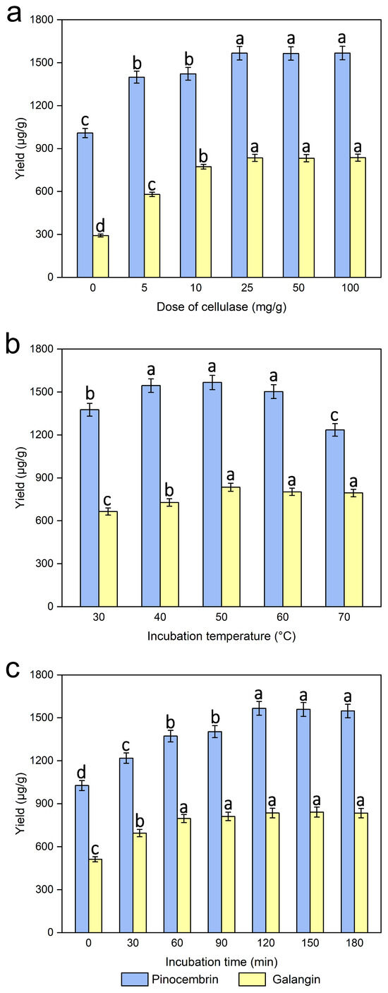 | Dose of Cellulase (mg/g) | Incubation Temperature (°C) | Incubation Time (min) | Predicted Galangin Yield (μg/g) | Actual Galangin Yield (μg/g) | Predicted Pinocembrin Yield (μg/g) | Actual Pinocembrin Yield (μg/g) | |