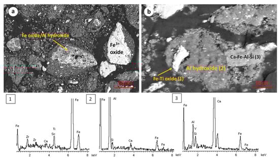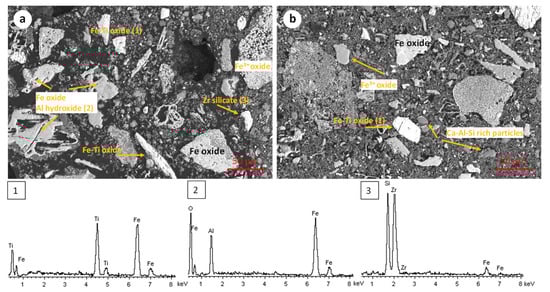 The microstructure of the RBR and TBR samples was revealed through scanning electron microscopy. The RBR samples display an inhomogeneous particle size distribution, ranging from a few μm to up to 200 μm. Iron (Fe3+) oxides in few cases occur as relative pure particles, and mostly co-exist with aluminum oxyhydroxide in agglomerated particles (Figure 2a,b). Small particles rich in Ca-Na-Al-Si form a colloidal substrate. Iron–titanium-rich particles (i.e., titanomagnetite or/and ilmenite) occur as relatively large (up to 100 μm), angular particles. Isolated silicate–zircon particles are rarely identified.