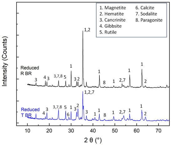 X-ray diffractometry accompanied by Rietveld quantitative analyses (Figure 4, Table 6) showed that hematite and goethite phases in RBR and TBR are partially reduced to magnetite. The conversion degree of Fe3+ oxides to magnetite reaches 76% in the case of RBR, and 49.6% in the case of TBR. Cancrinite is the major non-ferrous species in both reduced residues. The sodalite content in both samples is significantly reduced compared to the initial samples. Gibbsite concentrations remain largely unchanged, with a slight decrease observed in RBR and a slight increase in TBR. Boehmite is not detectable, indicating the leaching of aluminum in the alkaline liquor (Table 4). The presence of non-dissolved gibbsite may be attributed to its encapsulation in refractory phases. The calcite amount is significantly reduced; however, calcium-containing phases were not detected in the reduced samples via X-ray diffractometry. According to the literature, calcium carbonate is converted to Ca(OH)2 in the presence of NaOH [32], suggesting that Ca(OH)2 may have formed as an amorphous phase. On the contrary, reduced samples are enriched in rutile. The limited reducibility of the TBR sample can be attributed to specific structural characteristics, not revealed through SEM investigation, which possibly enhance agglomeration phenomena and impede the reduction reaction.