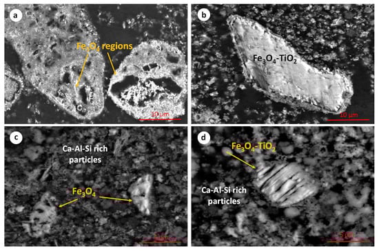 The microstructure of the hydrothermally reduced RBR and TBR samples is shown in the SEM micrographs in Figure 5. The presence of iron oxide and Ti-containing iron oxide particles is observed. EDS semi-quantitative analysis indicates that the iron-to-oxygen mass ratio in both phases corresponds to that of magnetite. The titanium concentration in the Ti-containing particles (titanomagnetite or/and ilmenite) is up to 5 wt.%. These particles likely consist of a mixture of Fe3O4 and titanium dioxide, or they may correspond to titanomagnetite species. Their precise mineralogical micro-composition will be investigated, using transmission electron microscopy, in a future work. In several cases, magnetite particles (Figure 5a–d) exhibit a hollow structure, which may be attributed to a dissolution–reprecipitation mechanism during the transformation of Fe3+ oxides into the magnetite phase. This specific mechanism has been reported in aqueous systems containing iron oxides [33,34].
