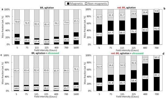 Figure 6 illustrates the mass distribution of magnetic and non-magnetic fractions resulting from the magnetic separation of both the untreated (Figure 6a,c) and the hydrothermally reduced RBR samples (Figure 6b,d), which were dispersed either through agitation or combining agitation and sonication. Low retention is observed in the case of the untreated RBR sample—particularly when magnetic induction values up to 700 Gs are applied. Under these conditions, the magnetic fraction does not exceed 41.6% of the initial feed mass, indicating low iron oxide retention (the initial iron oxide content in the sample was 39.18 wt.%—see Table 3). Increasing the magnetic induction to 1600 Gs significantly improves retention (Figure 6a). When ultrasound is applied, a consistent reduction of 10–15% in the magnetic fraction is observed across the entire range of magnetic induction (Figure 6c), suggesting that this method of dispersion hinders magnetic agglomeration or alters dispersion behavior.