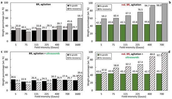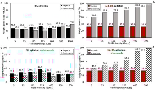Iron recovery and grade (%) as a function of the magnetic induction in magnetic fractions produced by the separation of the: untreated RBR under agitation (a), untreated RBR under the combination of agitation and sonication (c), reduced RBR under agitation (b), and reduced RBR under the com-bination of agitation and sonication (d).