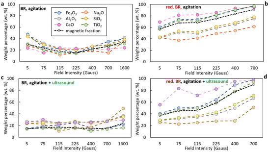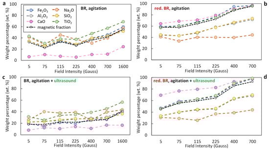 Distribution of major oxides (Fe2O3, Al2O3, Na2O, SiO2, CaO, TiO2) in the magnetic fraction obtained from Turkish-origin bauxite residue (BR) (a,c) and hydrothermally reduced bauxite residue (red. BR) (b,d), as a function of applied magnetic induction. The black dashed line indicates the weight percentage of the magnetic fraction relative to the feed. Particle dispersion occurred either through agitation (a,b) or by combining agitation and ultrasounds (c,d).