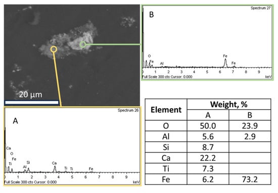 Figure 12. SEM-EDS image of a particle of the hydrothermally treated RBR sample composed by a non-iron-rich (A) and an iron-rich (B) region. The respective EDS spectra and the elements com-positions are quoted. - Magnetic induction and composition of magnetic fractions: the applied magnetic field in combination with the nature of the iron phases (Fe3+ oxides or magnetite) affects the magnetic fraction mass produced, either for raw and for hydrothermally treated samples. It was found that for the Romanian sample at 1600 Gs, the magnetic fraction obtained after the separation is 55% of the feed, while after hydrothermal treatment, the application of 5 Gs is enough for the magnetic fraction to be 58.2% of the feed, with similar findings for the TBR material. An increase in the magnetic fraction mass is accompanied by an enhancement of the Fe recovery, while selective distribution of certain elements either in the magnetic and non-magnetic fraction was demonstrated. More specifically, the distribution of Ti in the magnetic concentrates is very similar to, and in some cases slightly higher than, that of Fe. This can be attributed to the close association of the Ti phases with Fe oxides, as was revealed via scanning electron microscopy (Figure 2, Figure 3 and Figure 5), as well as to the fact that Ti-bearing minerals exhibit only weak paramagnetic behavior, insufficient on its own to account for their retention during magnetic separation. Furthermore, a slight enrichment of the magnetic concentrate produced from the hydrothermally treated samples occurs for calcium. For the hydrothermally treated samples, Na2O, SiO2, and Al2O3 are distributed in the non-magnetic fraction which is attributed to their association with non-magnetic minerals.