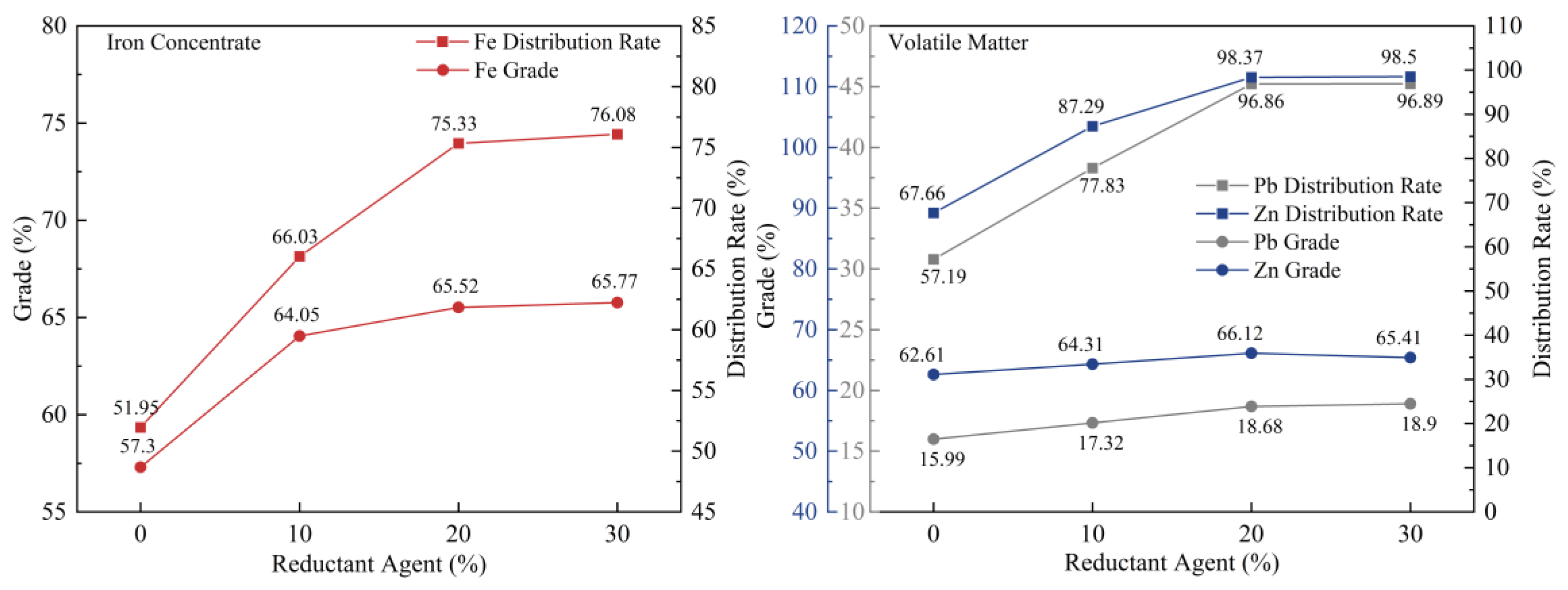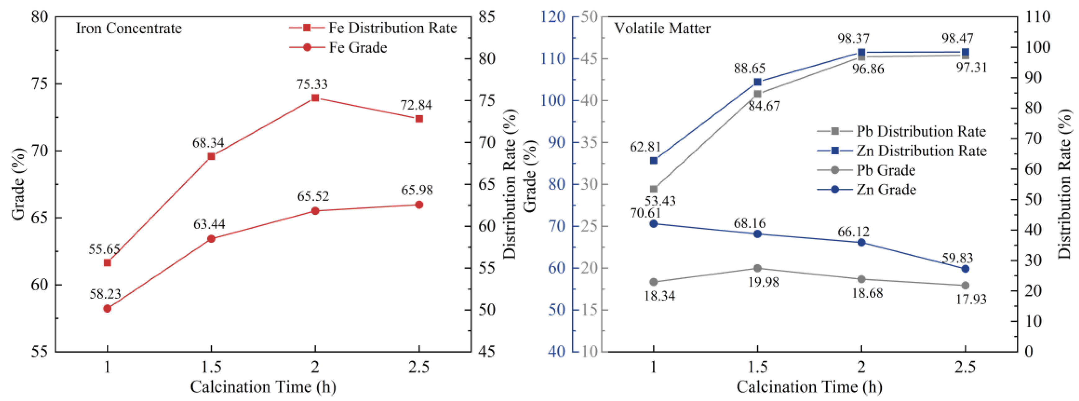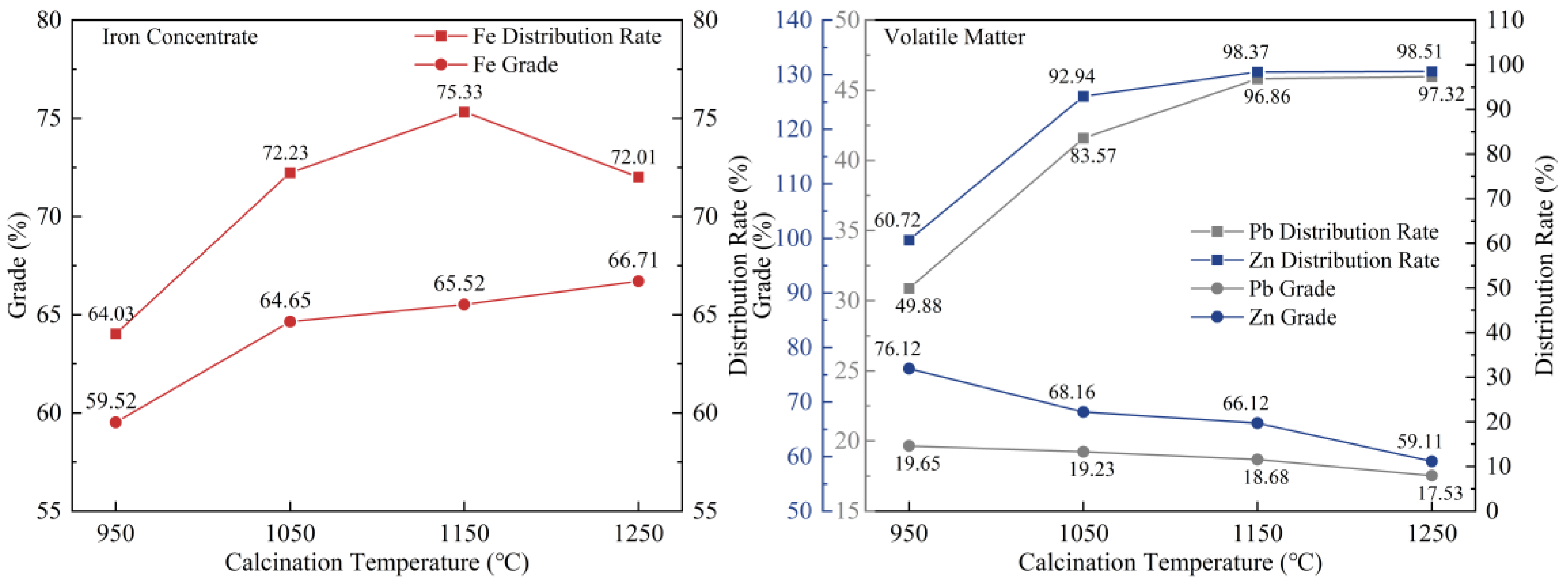 - Using a gasification reduction calcination–grinding-weak magnetic separation process, with a calcination temperature of 1150 °C, 20% anthracite as the reducing agent, and a calcination time of 2 h, the distribution ratios of Pb and Zn in the volatile matter reach 96.86% and 98.37%, respectively. When the roasted sand is ground to a particle size of D90 = 0.085 mm, an iron concentrate with an Fe grade of 65.61% can be obtained.
