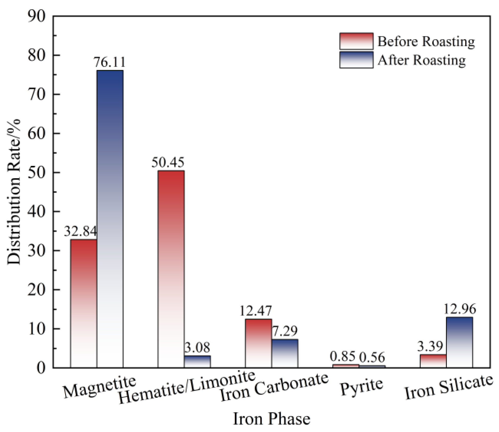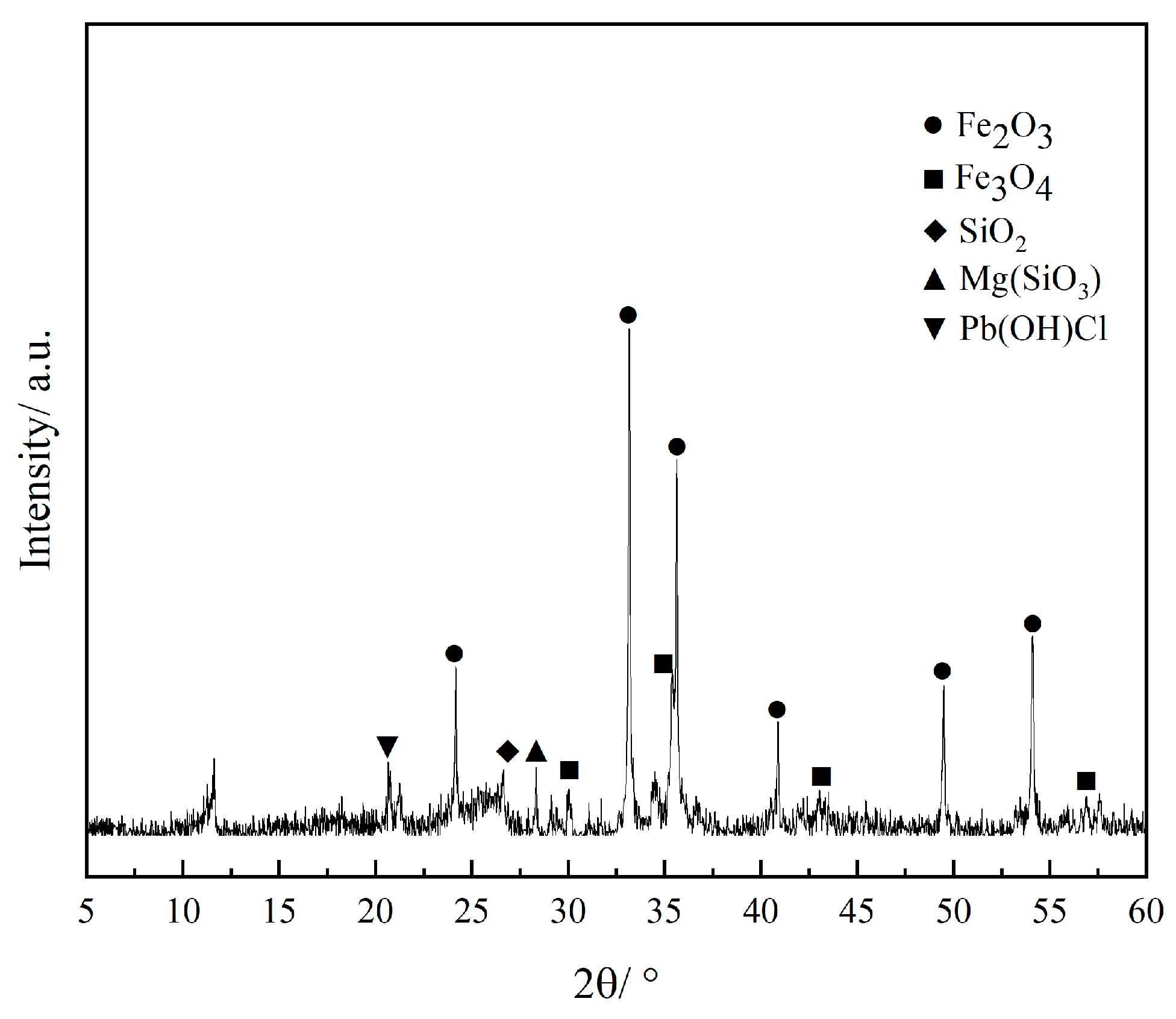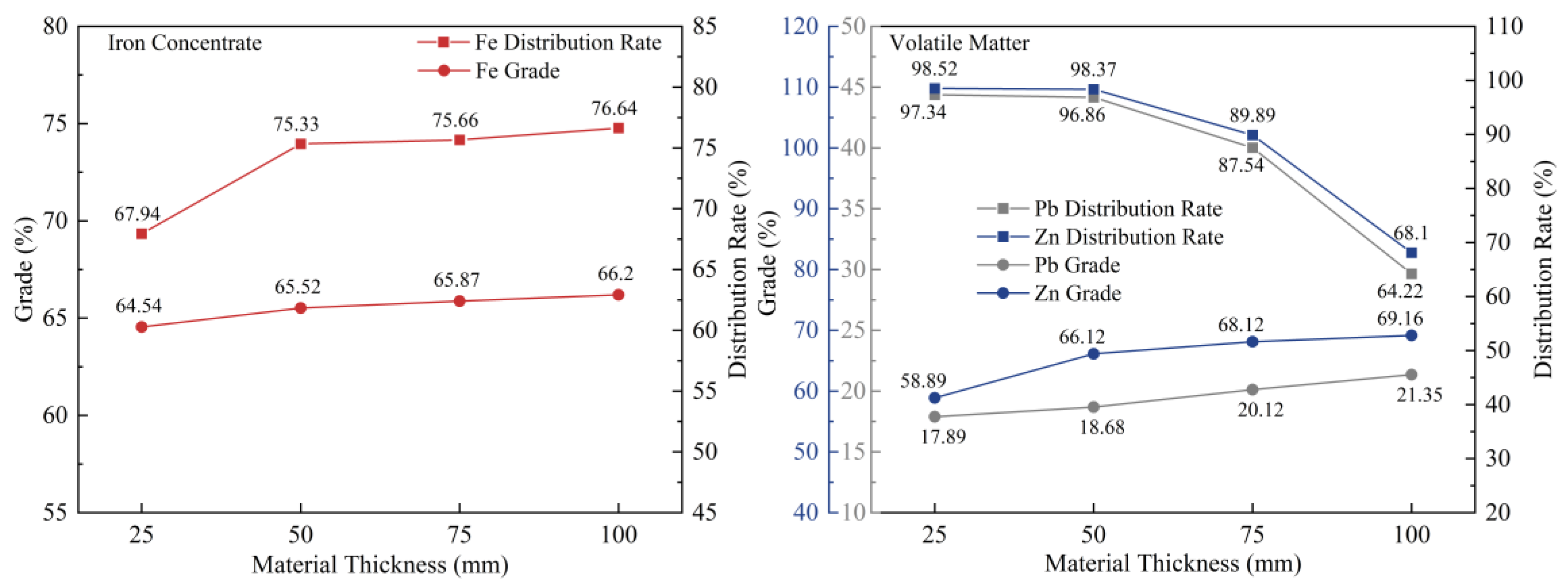 - Using a gasification reduction calcination–grinding-weak magnetic separation process, with a calcination temperature of 1150 °C, 20% anthracite as the reducing agent, and a calcination time of 2 h, the distribution ratios of Pb and Zn in the volatile matter reach 96.86% and 98.37%, respectively. When the roasted sand is ground to a particle size of D90 = 0.085 mm, an iron concentrate with an Fe grade of 65.61% can be obtained.