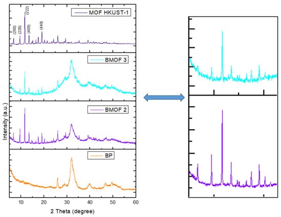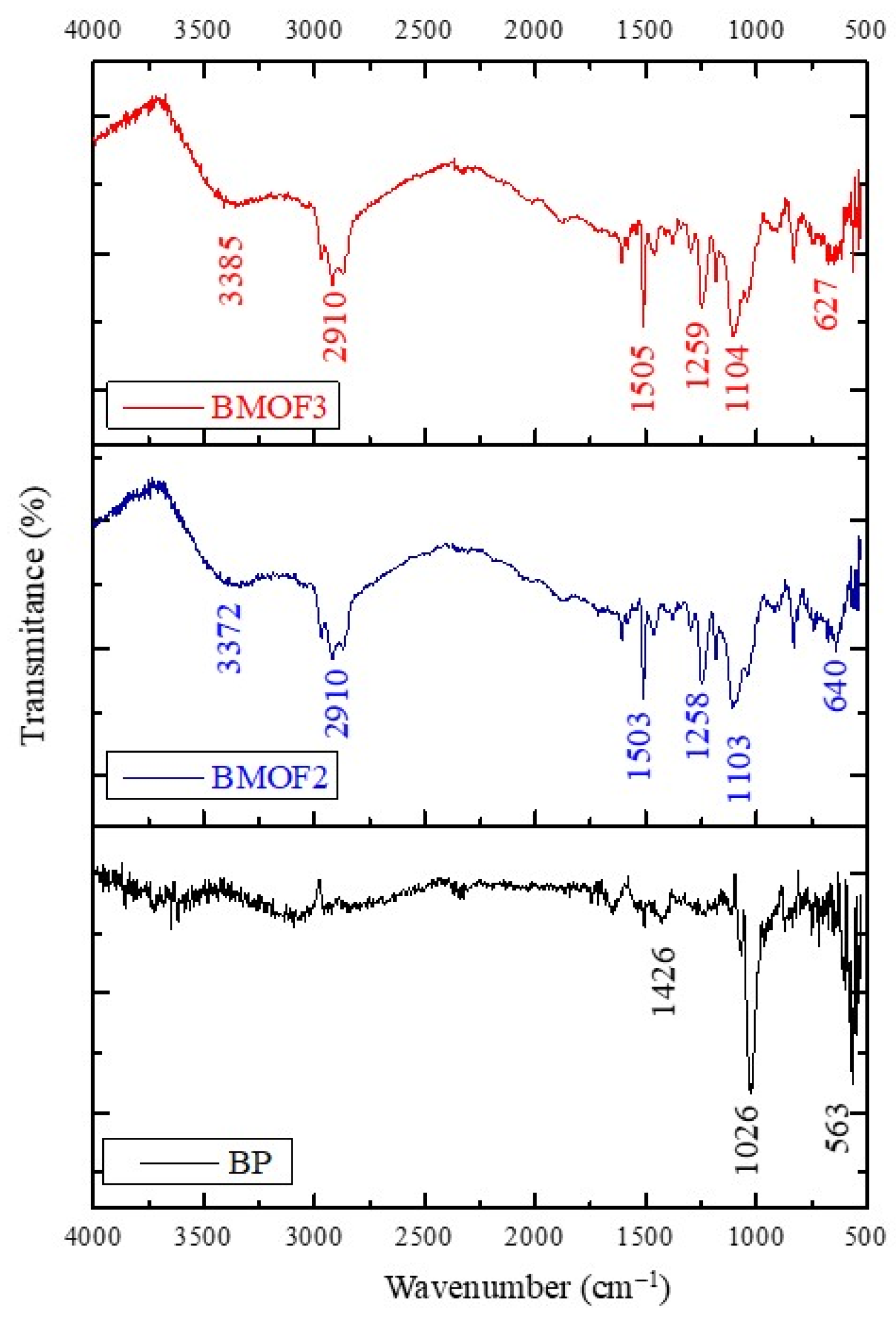 3.2. Characterization of BP, BMOF2, and BMOF3 Materials