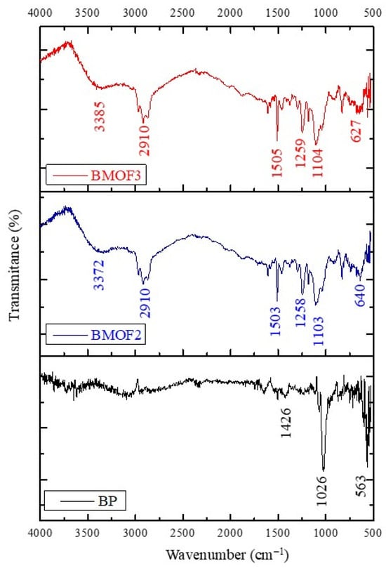 Figure 4. FTIR spectra of BP, BMOF2, and BMOF3.