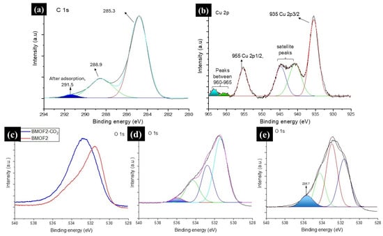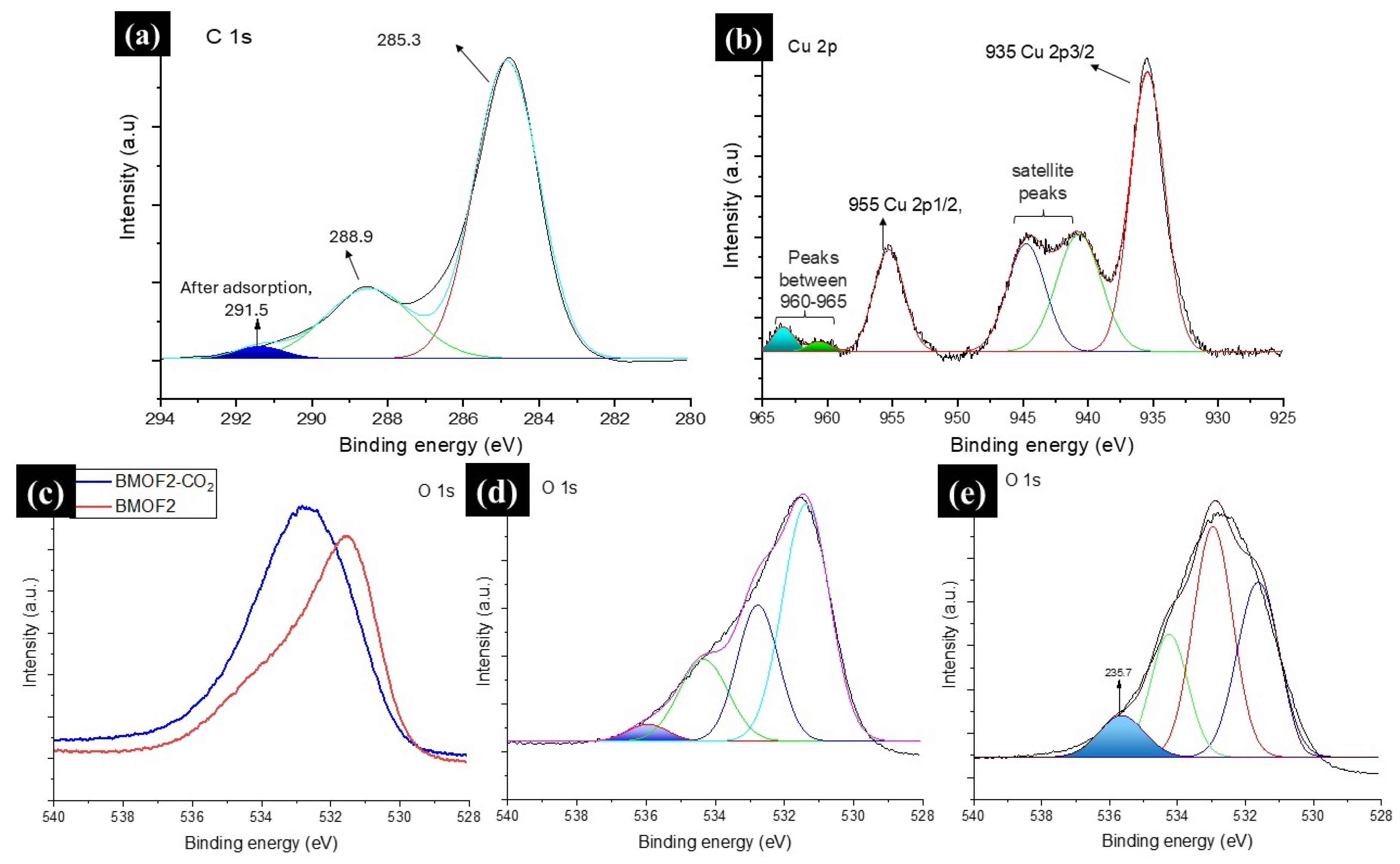 Figure 8. X-ray Photoelectron Spectroscopy (XPS) analysis of BMOF2 and BMOF2CO2. (a) C1s; (b) Cu2p; (c) O1s for BMOF2 and BMOF2–CO2; (d) O1s for BMOF2–CO2; (e) O1s BMOF2.