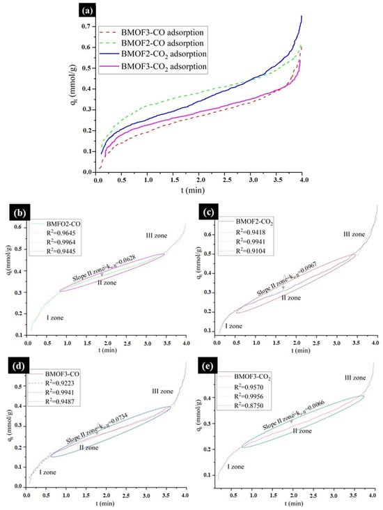 Since the curves in Figure 9a do not approach equilibrium and exhibit zones defined by linear segments, some more linear than others, and the segment of the second zone is longer than the rest, an effective kinetic coefficient (ke-II) was defined as the slope of this zone in each case (Figure 9b–e). Because ke-II (BMOF2-CO2) > ke-II (BMOF2-CO), CO2 could exhibit a greater consistent kinetic affinity for basic sites. This is because the significant phase of the composite is rich in phosphate groups (PO43−), calcium ions (Ca2+), and hydronium ions (-OH), to which CO2 has affinity. Additionally, in BMOF2, HKUST-1 was synthesized in aqueous media, indicating that water molecules remain coordinated to the Cu2+ nodes. Defects are generated by partial hydrolysis (due to vacancies in the organic ligand) and surface (-OH, terminal Cu-OH, and other basic Lewis sites such as those mentioned above are found in greater “quantity” [45,65]. Thus, the material exhibits a greater affinity for a Lewis acid gas, such as CO2.