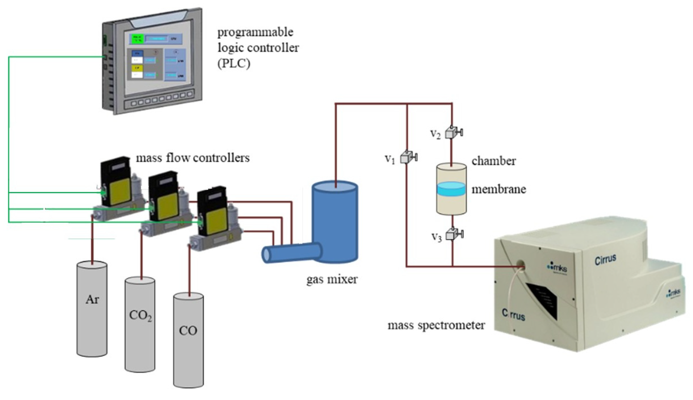 Figure 1 illustrates the system for CO and CO2 capture from the gas mixture simulating the residual gas obtained during GHG treatment using plasma technology. Flow gases pass through the solid matrix at 1 lpm, 1 bar, and 298 K. There are two parallel lines: one allows verification of the initial concentrations of the input gases (V1), and the second contains the filter made of the composite (V2). The outputs of both lines are connected to the MKS Cirrus mass spectrometer (MKS Inc., Andover, MA, USA) to analyze the evolution of gas concentrations and validate the capture of CO and/or CO2. V3 is the output to the detector.