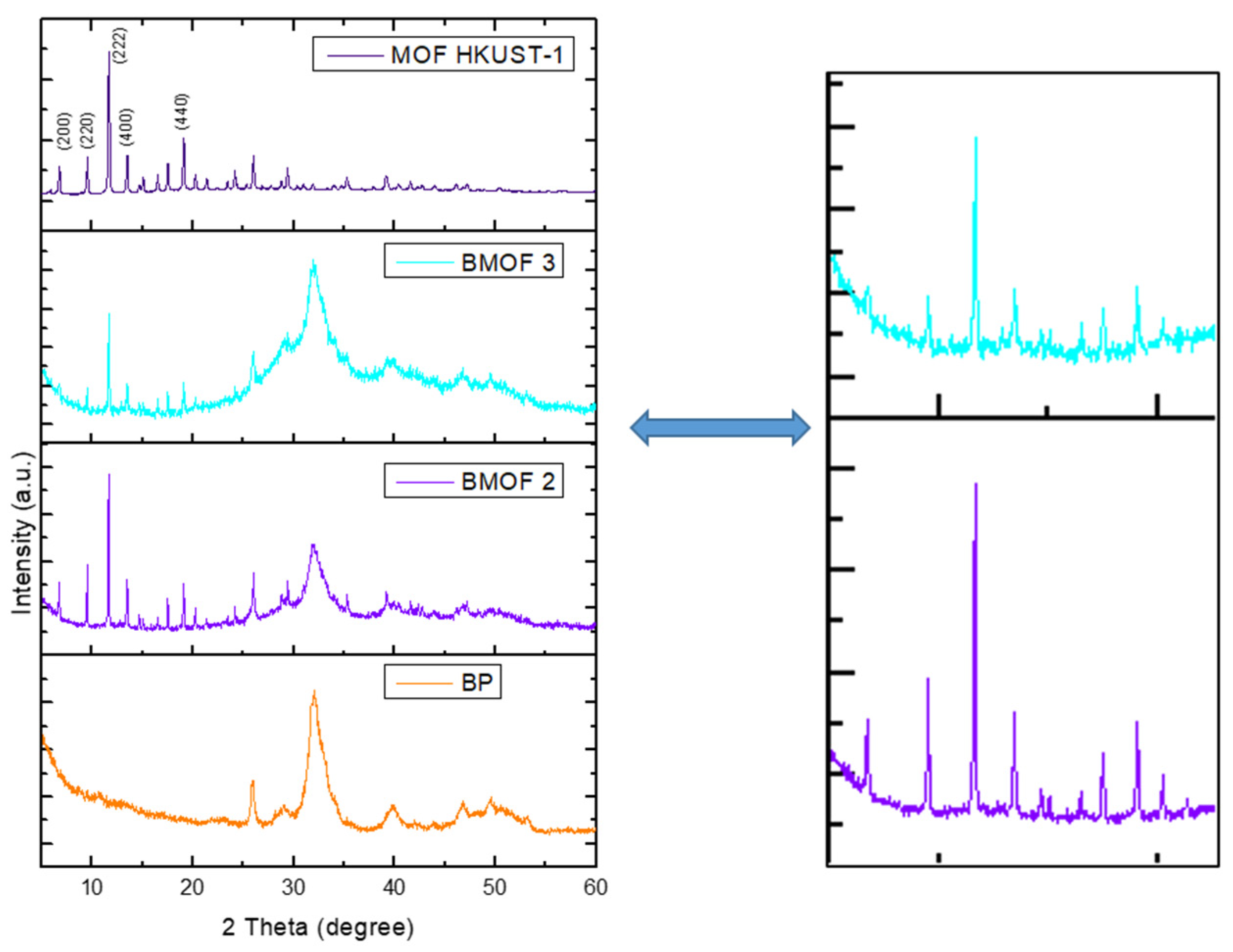 The MOF HKUST-1 composites were prepared under two different methodologies. The first synthesis of the composite followed the procedure reported by Kim et al. [34], with some modifications. 0.825 g of copper (II) nitrate 2.5 hydrate (Cu(NO3)2·2.5H2O, Sigma–Aldrich Corporation, Burlington, MA, USA, 98%) dissolved in 50 mL of water, and 0.42 g of the 1,3,5-benzene tricarboxylic acid (H3BTC, Sigma–Aldrich, 95%) dissolved in 50 mL of ethanol were mixed with 2 g of BP. The mixture was then heated under reflux for 6 h with constant mechanical stirring at 200 rpm and 60 °C. After the reaction was complete, the product was collected by filtration. The powder product was dried at 80 °C under vacuum for 10 h and labeled as BMOF2.