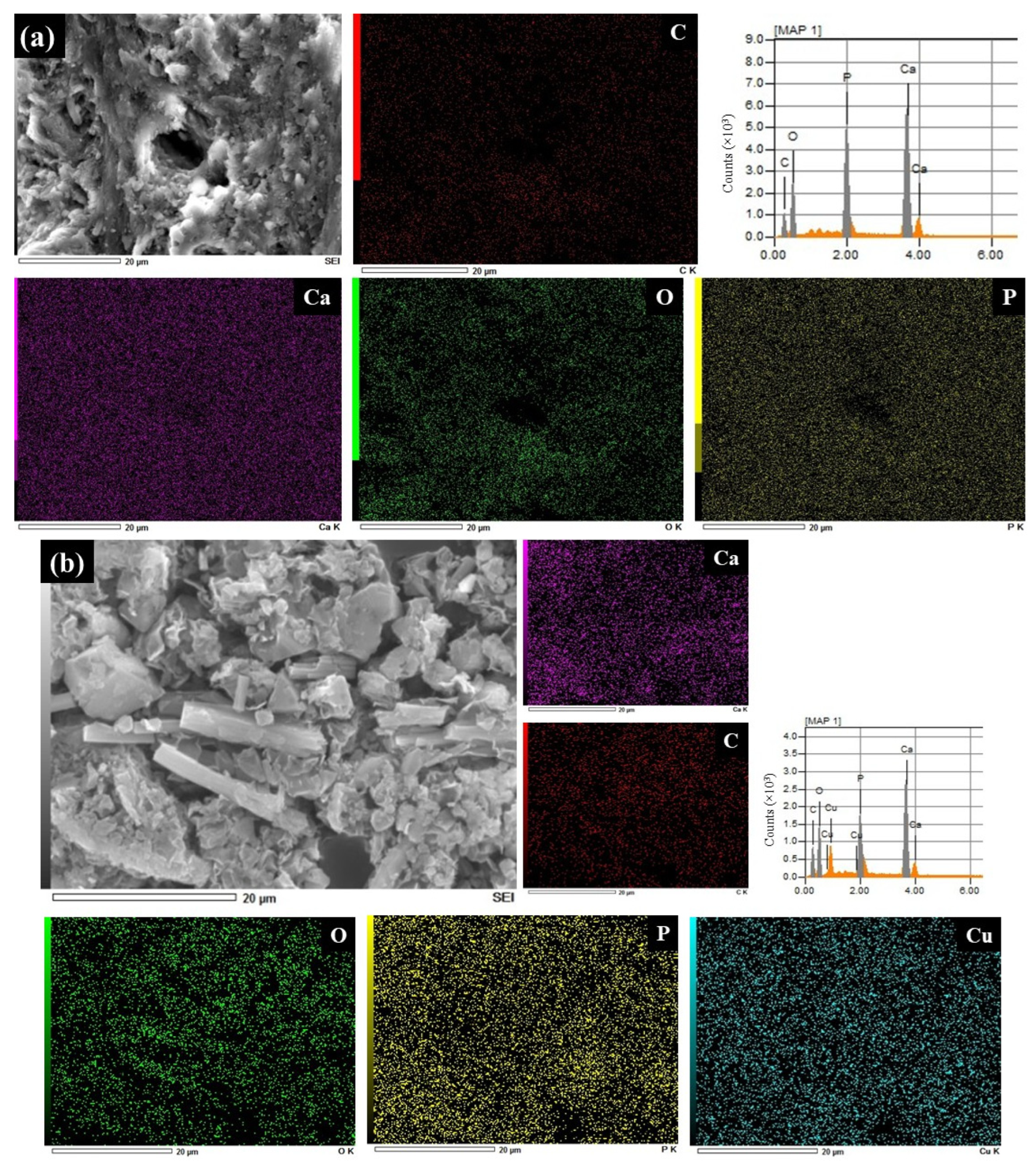 The chemical mapping of BP revealed Ca, C, O, and P, as expected (Figure 6a). In Figure 6b, the presence of copper on the composite is clear, in addition to the presence of one of its most abundant elements, Ca. Additionally, EDS analysis indicated Cu contents of 12.25% and 6.26% for BMOF2 and BMOF3, respectively. The difference may be due to 1 h of contact with BP in the copper solution before ligand addition.
