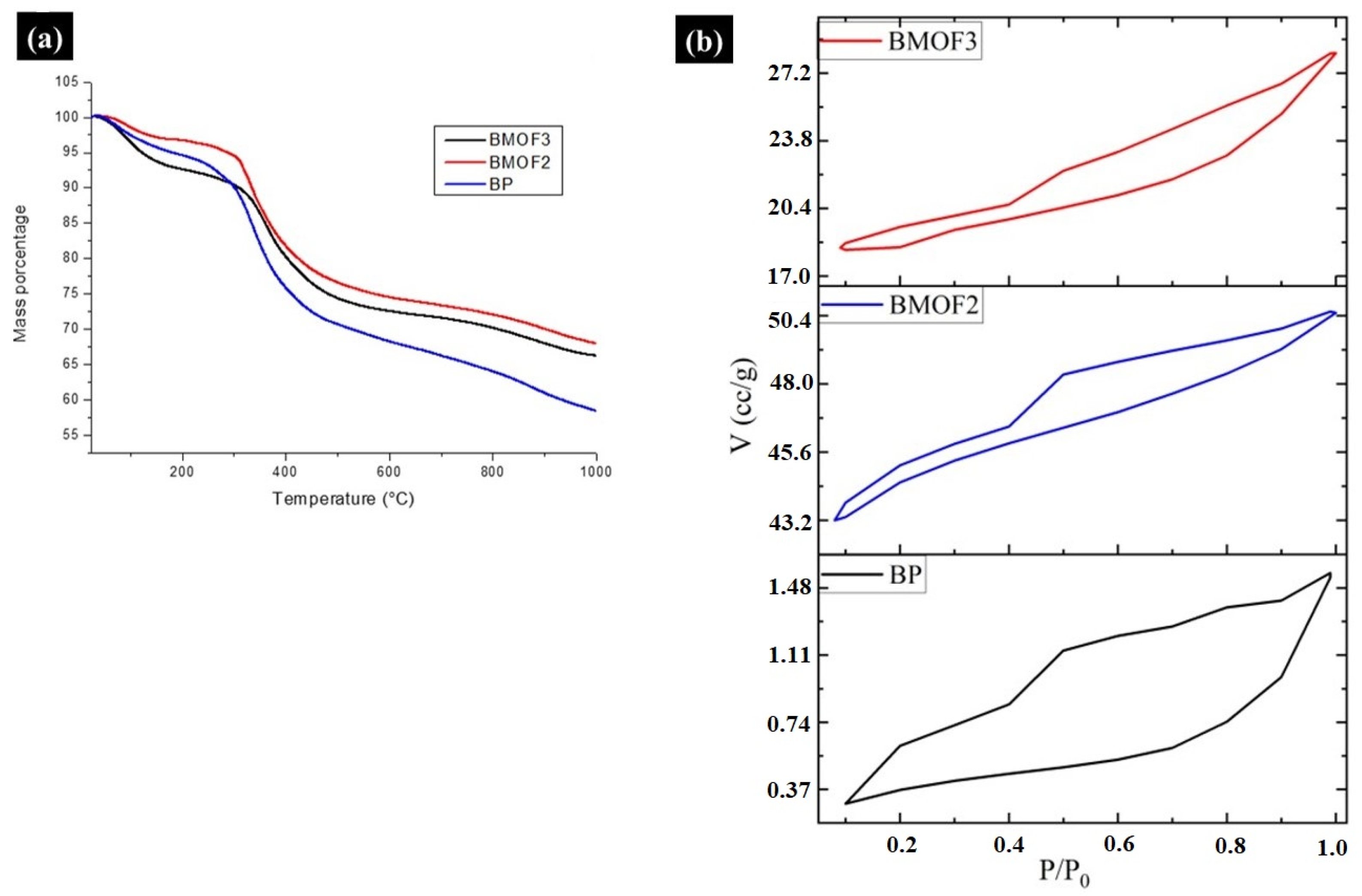 Figure 7. TGA curves with a heating rate of 5 °C per minute in He (a) and adsorption–desorption isotherms (b) for BP, BMOF2, and BMOF3.